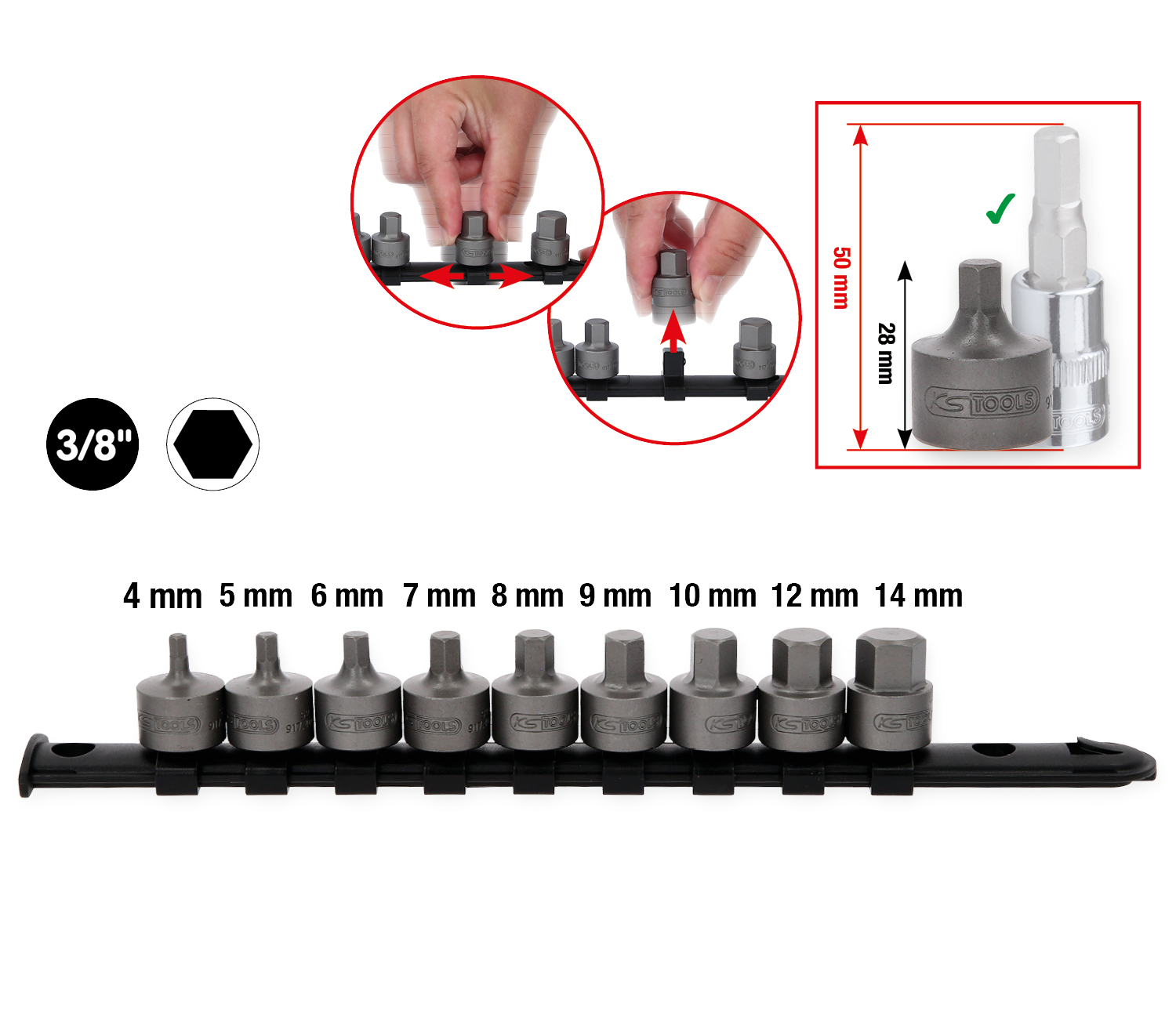 3/8" galatslēgu uzgaļu komplekts, īsi, 9 instr., 4-14 mm