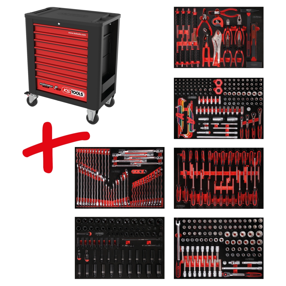 Performanceplus darbnīcas ratiņu komplekts P15 ar 423 instrumentiem, izvietošanai 6 atvilktnēs