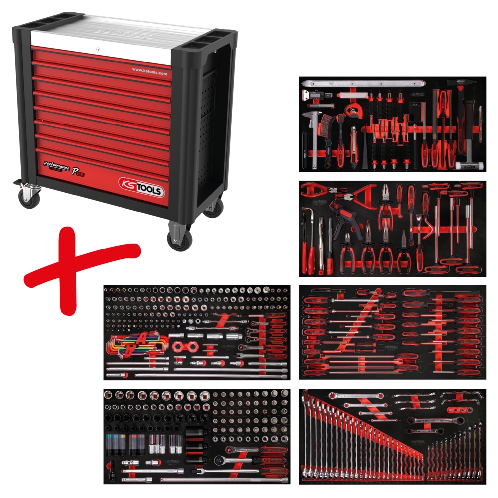Performanceplus darbnīcas ratiņu komplekts P25 ar 446 instrumentiem, izvietošanai 6 atvilktnēs