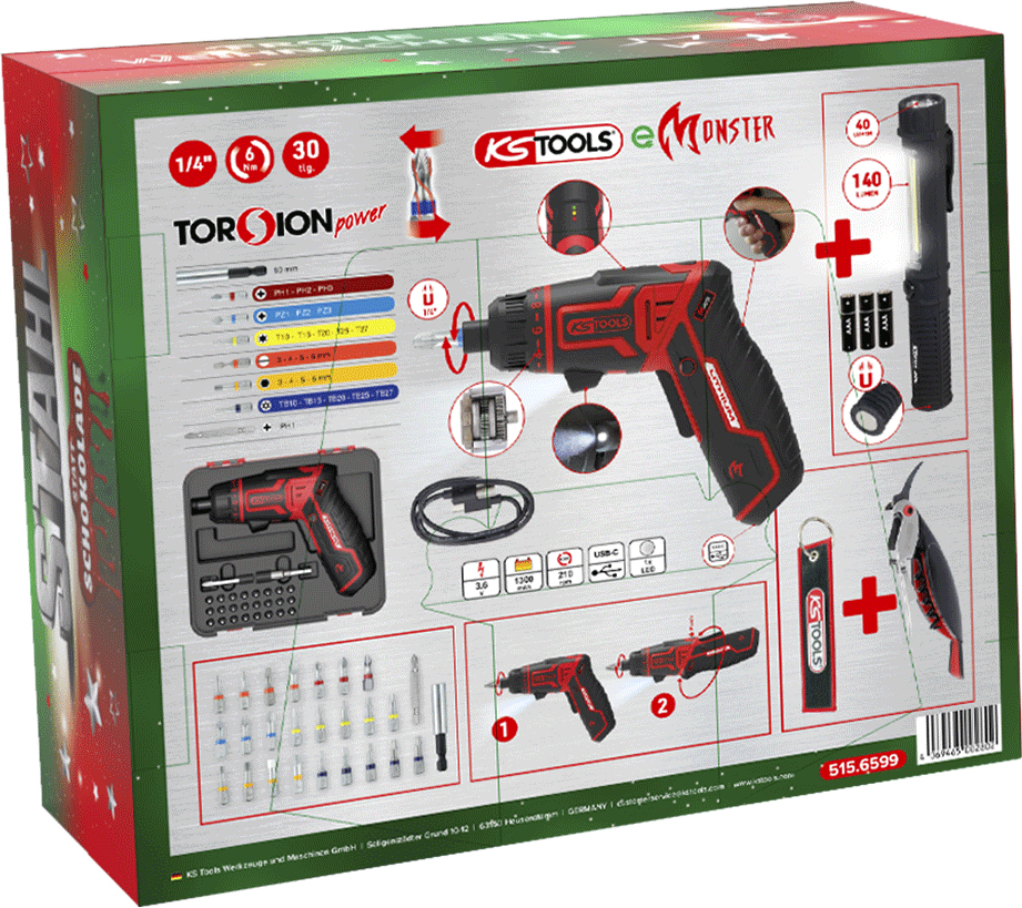 Jo viena lieta ir noteikti garantēta: rezultāts pēc 24. durtiņu atvēršanas ir tehnikas monstrs, ko iemīlēt. Nebaidieties, tas ir eMONSTER, jaudīgs akumulatora skrūvgrieža uzgaļu komplekts ar plašu piederumu klāstu.