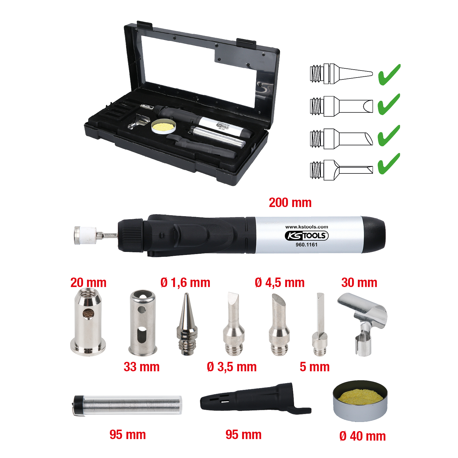 - komplektā ar dažādiem uzgaļiem, lodēšanas stieples spoli, lodēšanas sūkli
