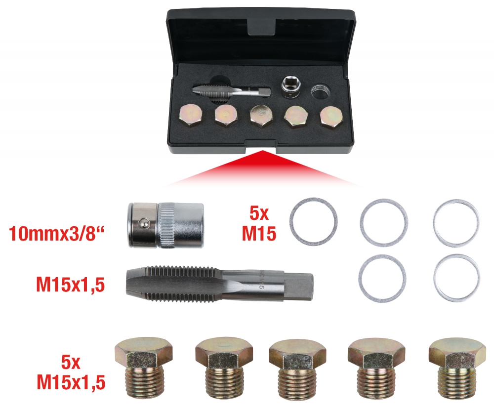 Eļļas nolaišanas skrūvju vītņu remonta komplekts, 12-daļīgs, M15 x 1,5