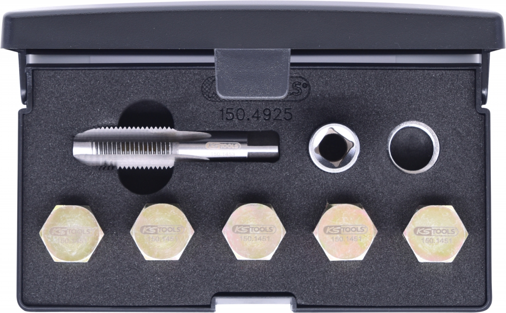 - paredzēts rūpīgam un ātram eļļas nolaišanas skrūvju vītņu remontam