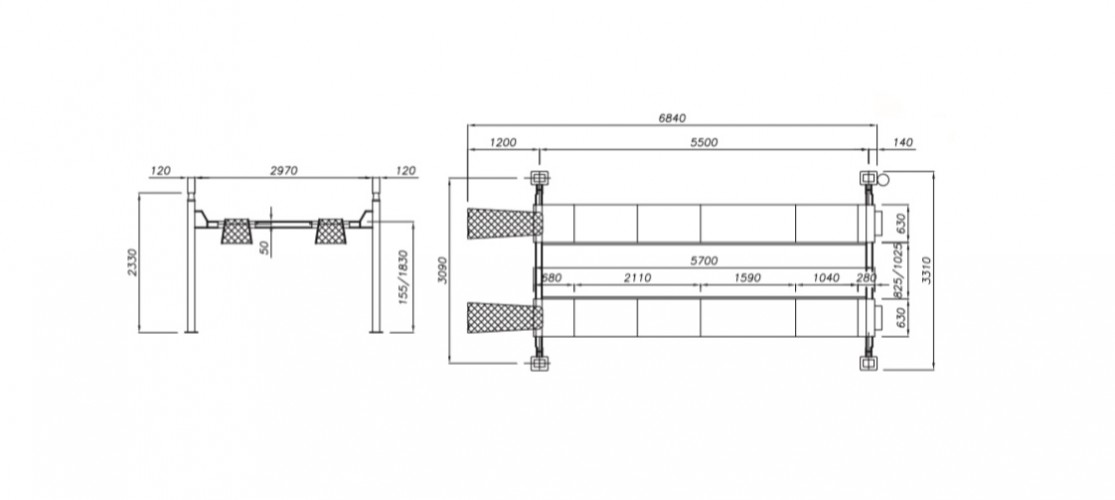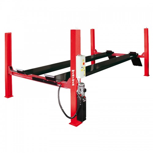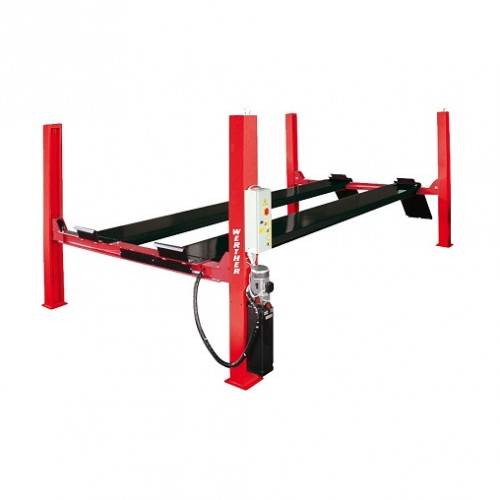 Elektrohidrauliskais ātrdarbīgais 4-statņu autopacēlājs, ar padziļinājumiem laipu priekšgalā grozāmplašu ievietošanai un, iebūvētām aizmugurējām slīdplatēm.