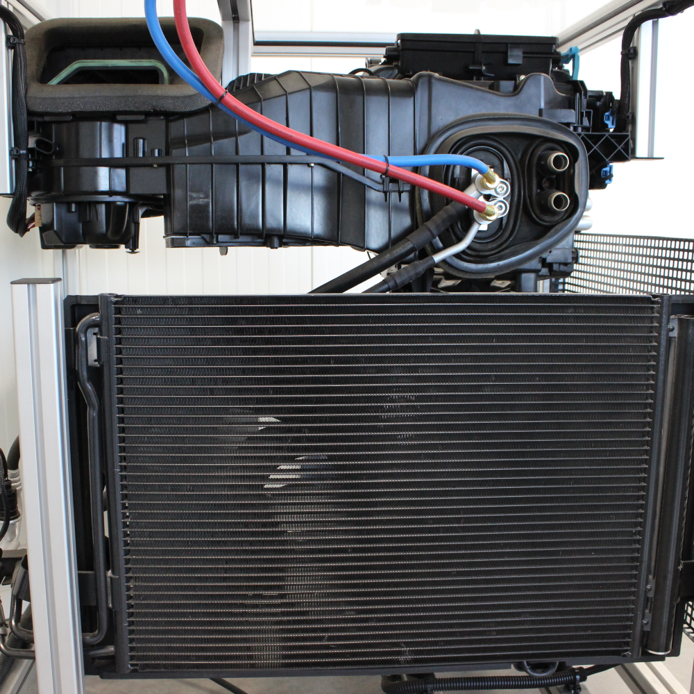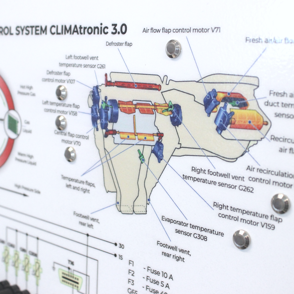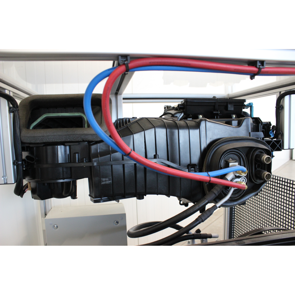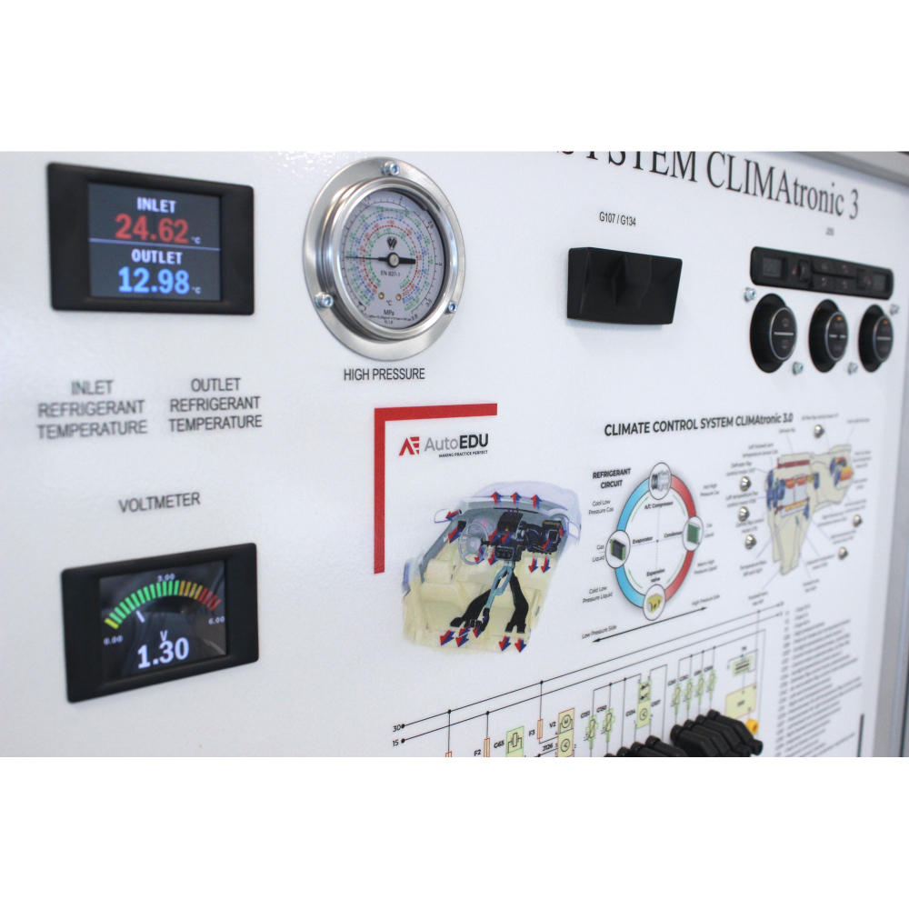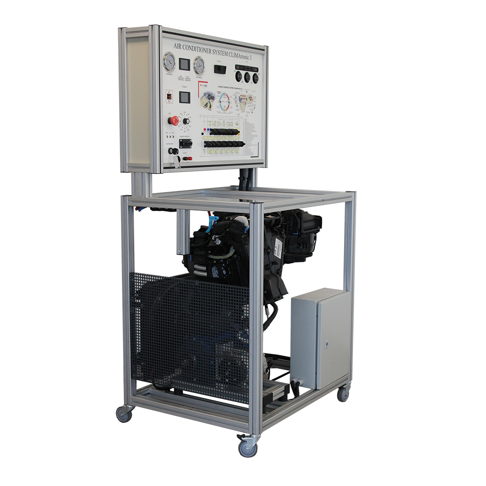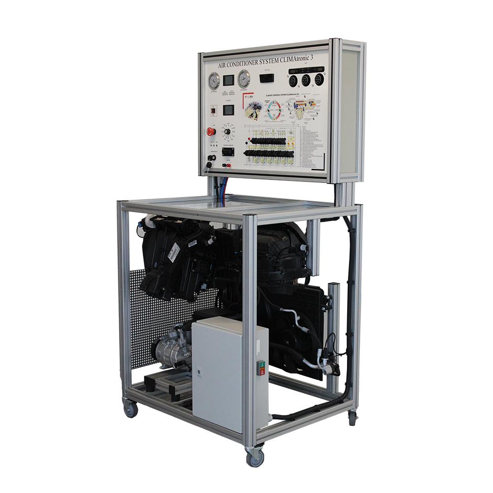 Fully functional Air-Conditioning system trainer with an expansion valve and electronic climate control system CLIMAtronic system, equipped with R134a refrigerant, offers diagnostic capabilities through an OBD 16-pole diagnostic socket and includes open contacts for measuring system components and circuits. Fault code simulations enhance the educational value of this versatile training tool, installed in a mobile aluminum frame, designed specifically for technical and vocational automotive education and training.