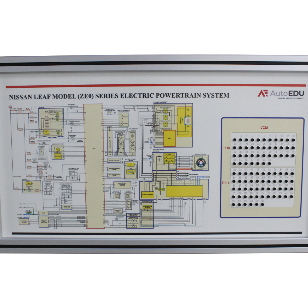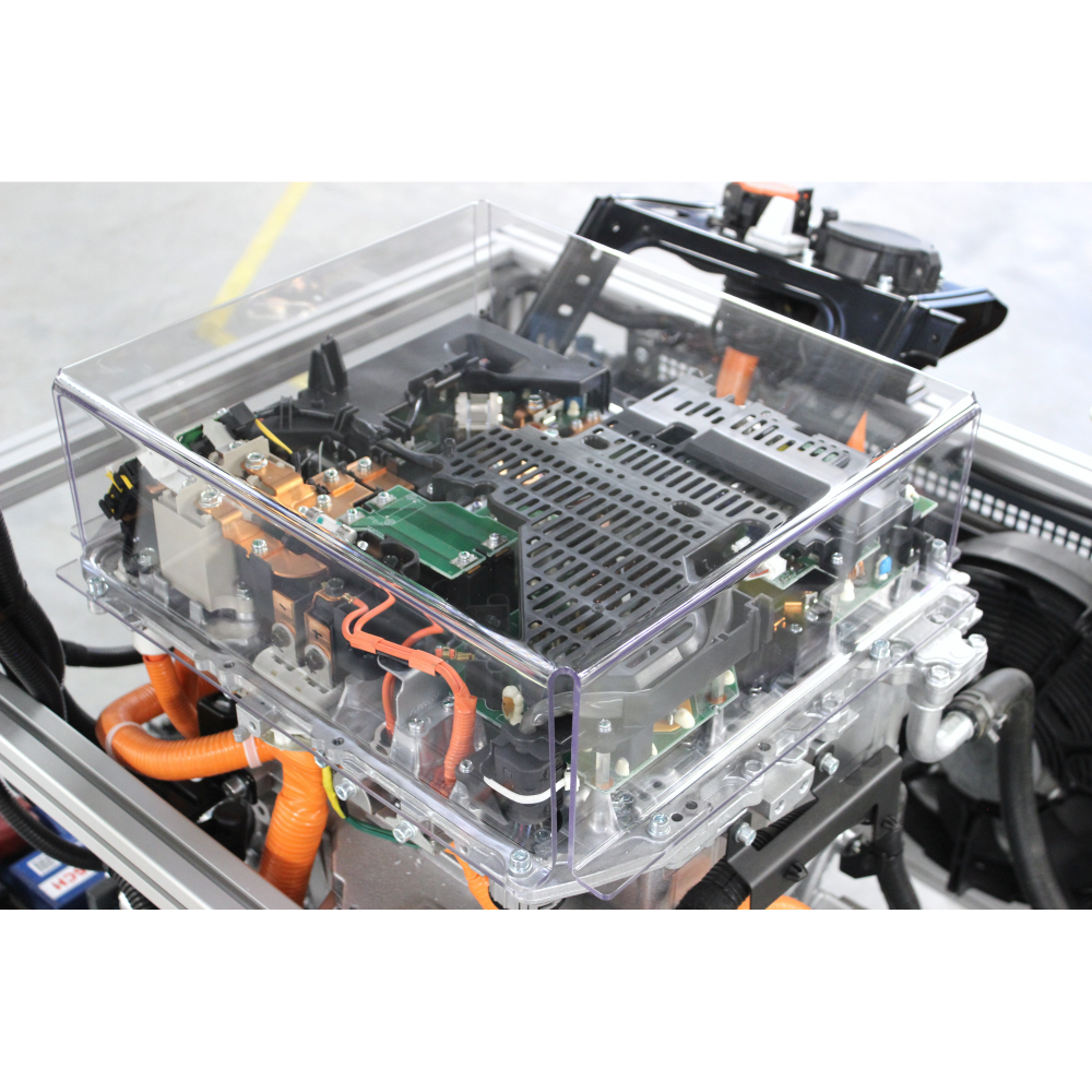 Fully functional electric vehicle training stand is based on the Nissan Leaf electric car, offering a practical and theoretical training experience using real electric vehicle components. This educational stand includes the main systems of electric vehicles, such as the electric motor, inverter, high-voltage battery, high-voltage cables, charging port and other essential elements. All components are connected with original high-voltage "orange" cables and covered with protective plexiglass for safety.