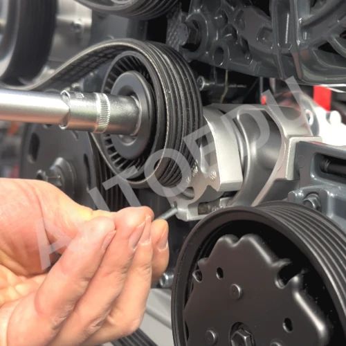Auxiliary belt replacement — tensioner release, belt removal, installation.