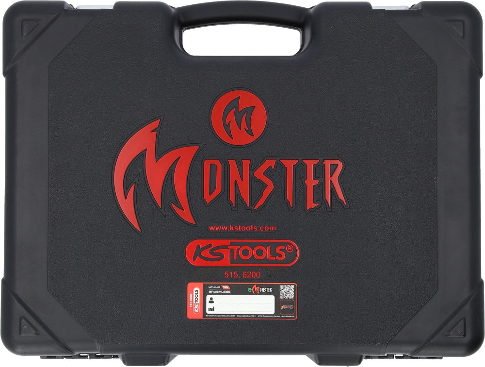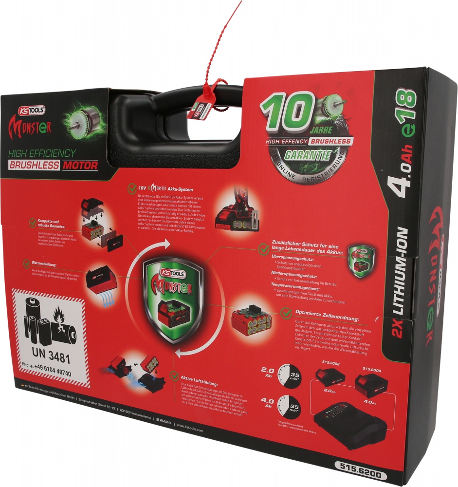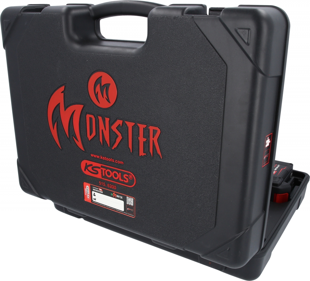 The included 8 A rapid charger charges the rechargeable battery extremely quickly and efficiently. The unit has a complex cooling system with active air cooling that effectively dissipates the heat generated during charging, and thus significantly extends the service life of the rechargeable battery. The LED display on the charger shows the various states of charge of the rechargeable battery. The intelligent system protocol of the eMONSTER product family ensures an effective and gentle rapid charging function by networking the tool, rechargeable battery and charger. By continuously monitoring these components, various protective functions such as overload protection, overvoltage or Undervoltage protection, temperature monitoring or emergency shutdown can be activated in the event of a possible fault. Defective or exhaustively discharged rechargeable batteries are detected immediately, something which significantly increases operational safety.