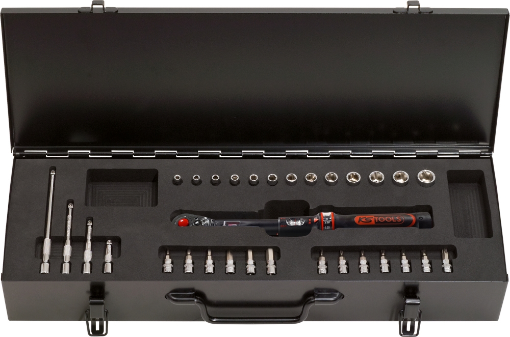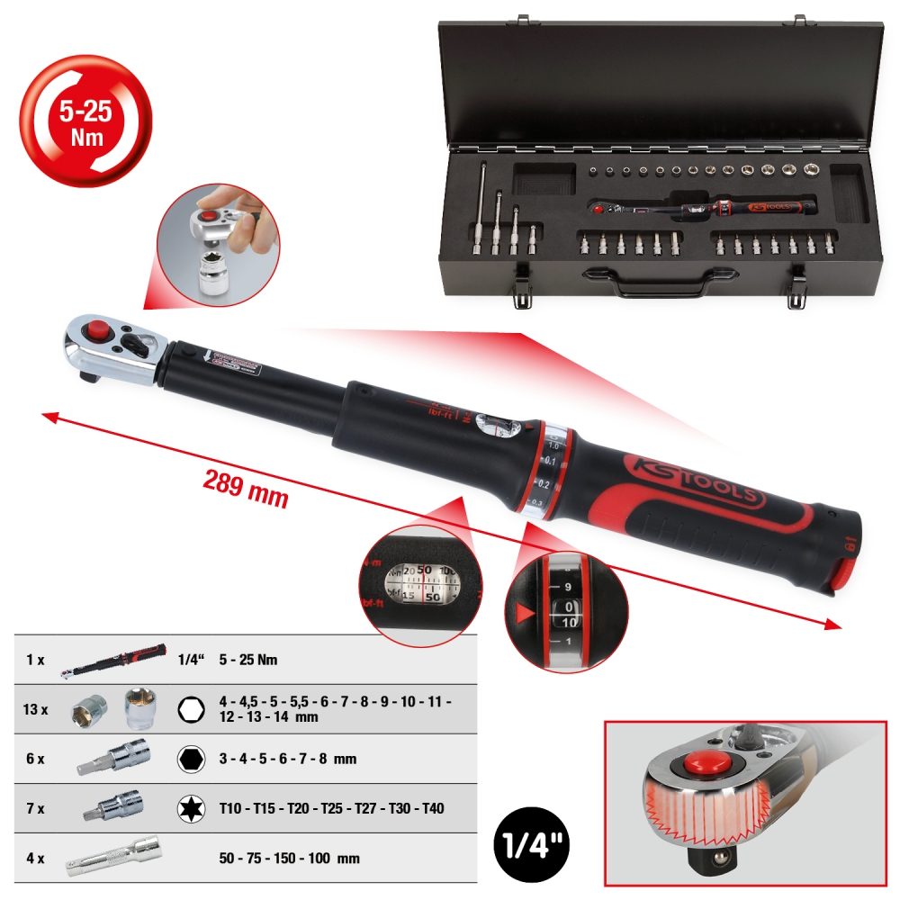 1/4" ERGOTORQUE®precision torque wrench set with reversible ratchet head, 5-25Nm, 31 pcs