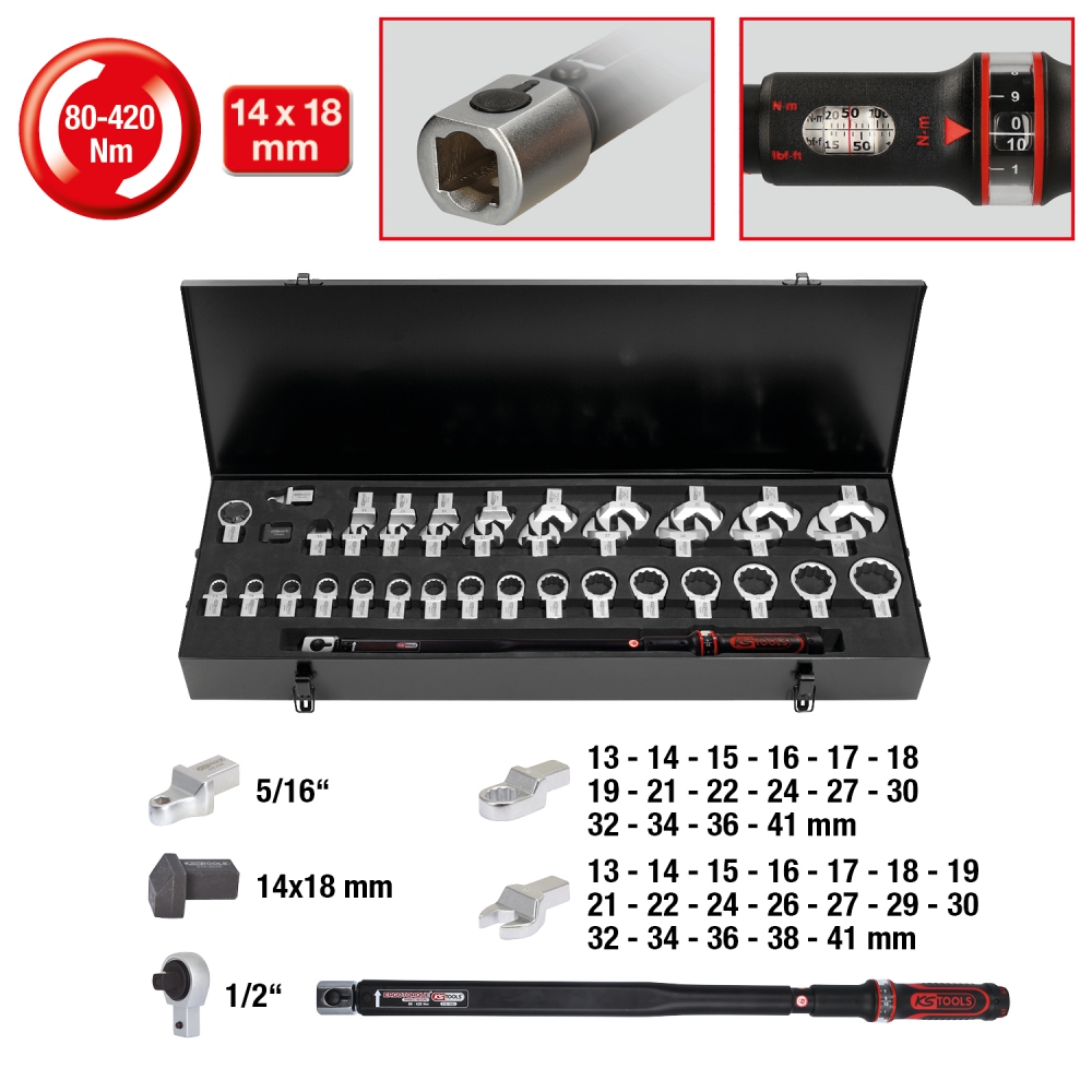 14x18mm ERGOTORQUE®precision torque wrench toolkit with retangular tool holder 80-420Nm, 39 pcs