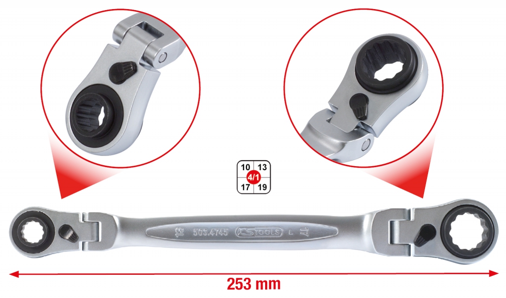 4 in 1 GEARplus flexible reversing double ratchet ring spanner, 10x13-17x19mm