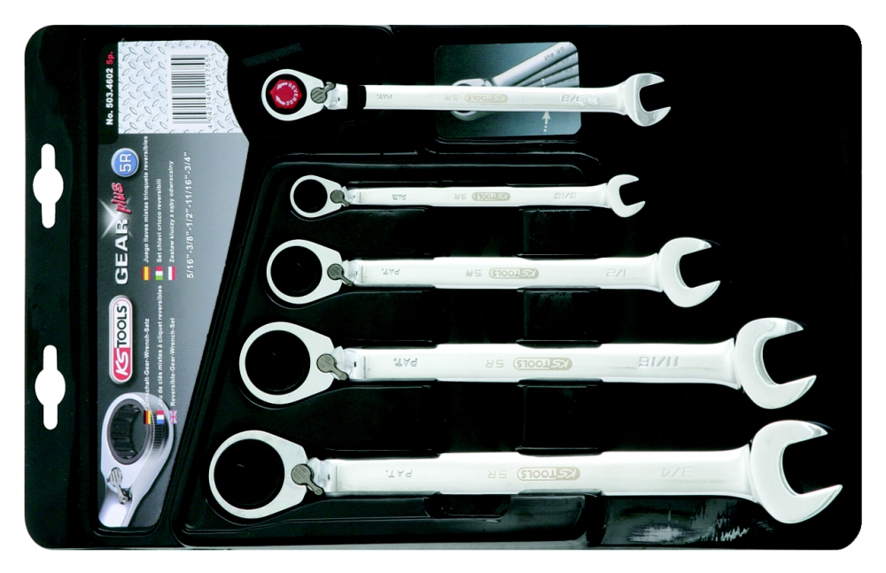 GEARplus Reversing combination ratcheting spanner set, 5 pcs, 5/16"-3/4"