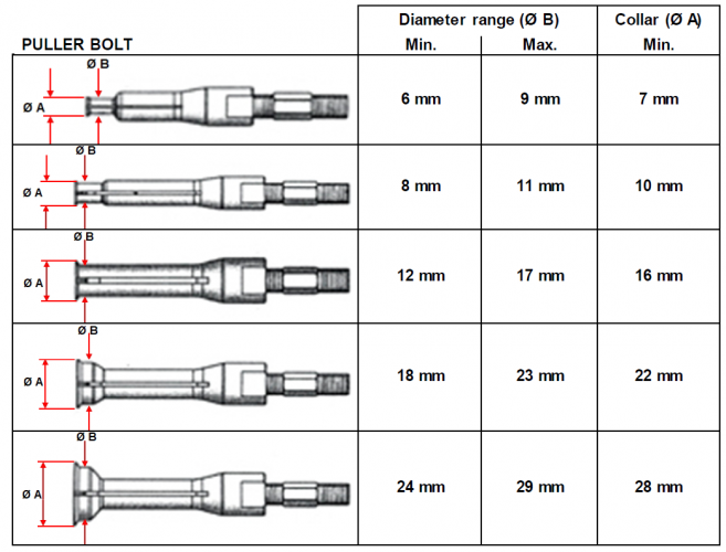 - 5 extraction mandrels for extracting of bearings with inner diameter 7 - 29 mm