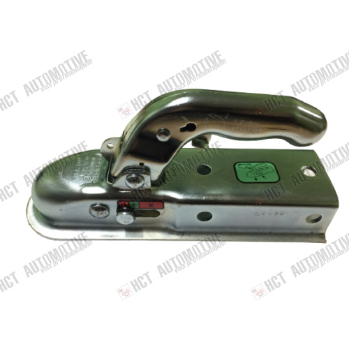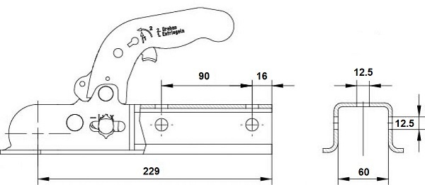 Square hitch mechanism KNOT with indicator. Designed for unbraked trailers with a total weight not exceeding 1400 kg. Compatible with 60 mm diesel. The hitch mechanism has two vertically positioned mounting holes on top and two horizontally positioned mounting holes on each side, with a diameter of 12.5 mm.