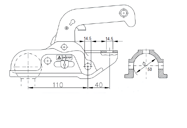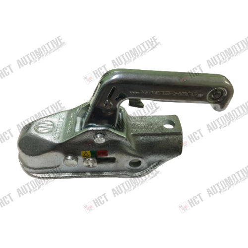 Hitch mechanism Winterhoff WW 30-D3-K1414 with indicator made of cast iron. For trailers up to 3000 kg. Maximum vertical load 150 kg. Compatible with 50 mm tow ball. One horizontal mounting hole on each side with a diameter of 14.5 mm and one vertical hole with a diameter of 14.5 mm.