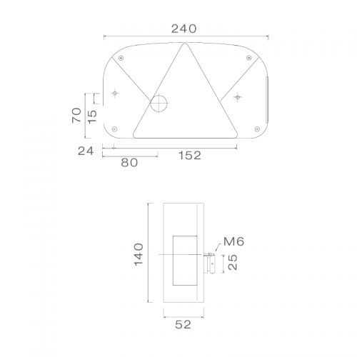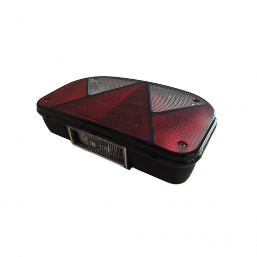 Rear left MULTIPONT II 12V light. Dimensions: 240x140x52 mm, distance between mounting points 152 mm. The light has 5 functions: rear position, brake, fog, turn, and downward number plate illumination. The light has a 5PIN bayonet and is E-marked.