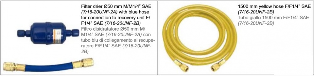 Complete with filter-drier and connecting blue hose, and yellow hose 1500mm
