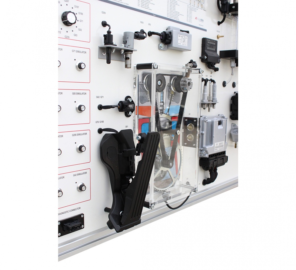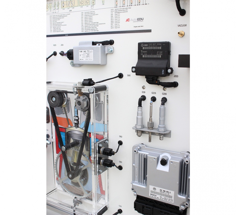 • Sensor Data Interpretation: Read and interpret voltage signals from various engine sensors for accurate diagnostics in live data. Measure high voltage circuit of the ignition system. The training board has a complete electric wiring diagram of direct petrol(gasoline) injection system (FSI). Ability of control unit encoding/configuration.