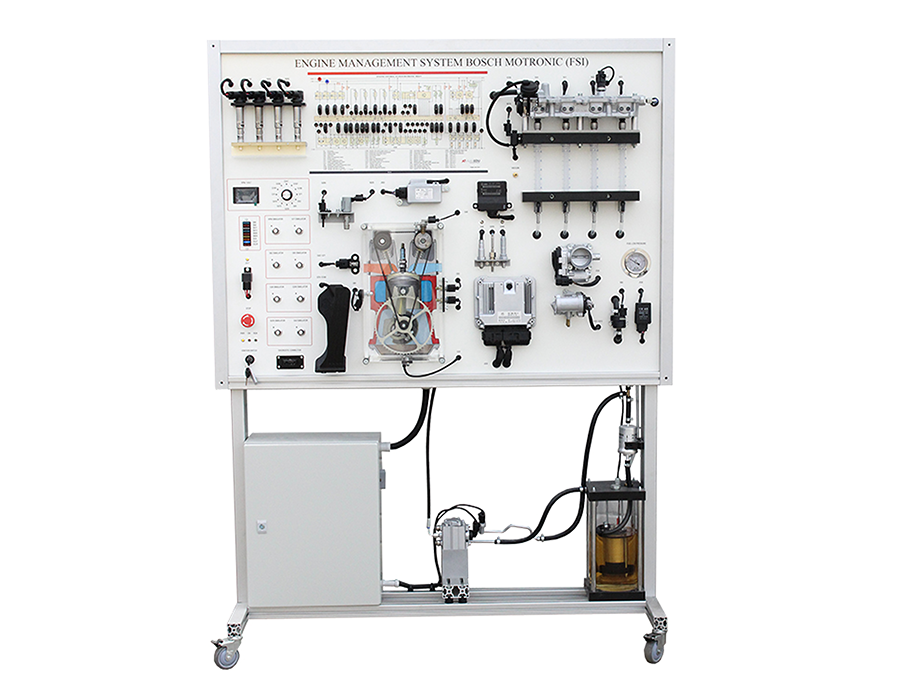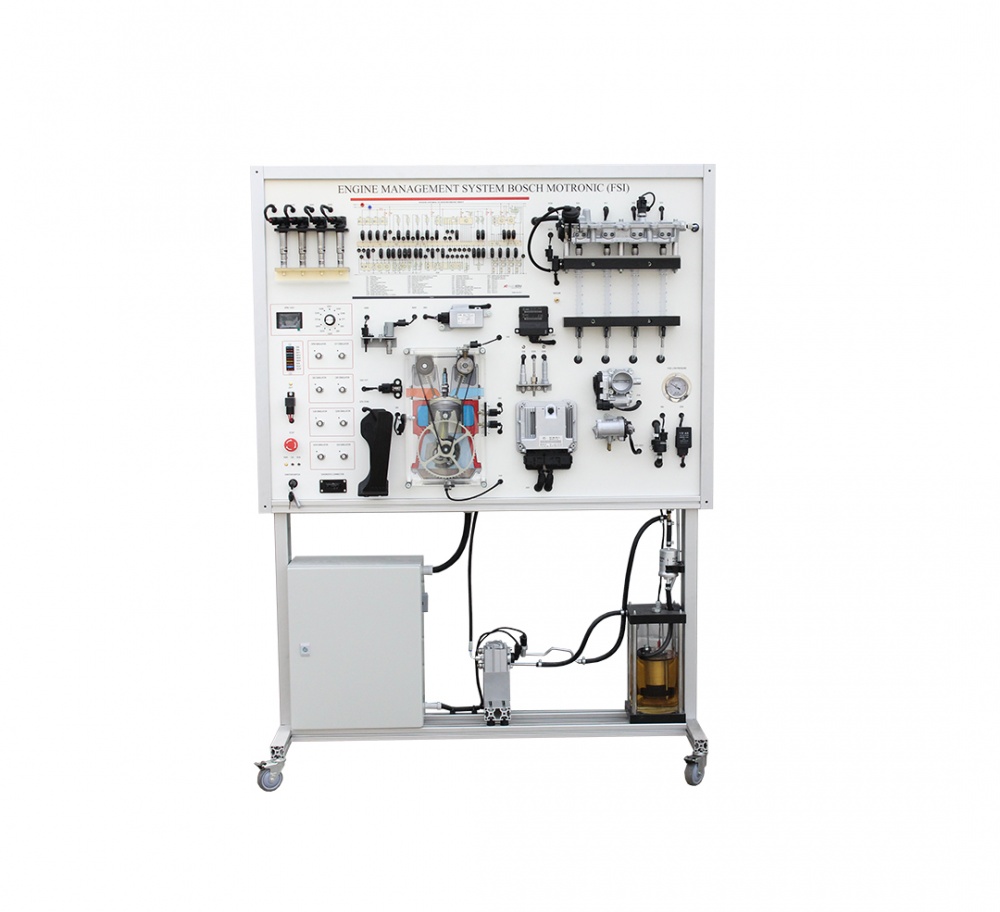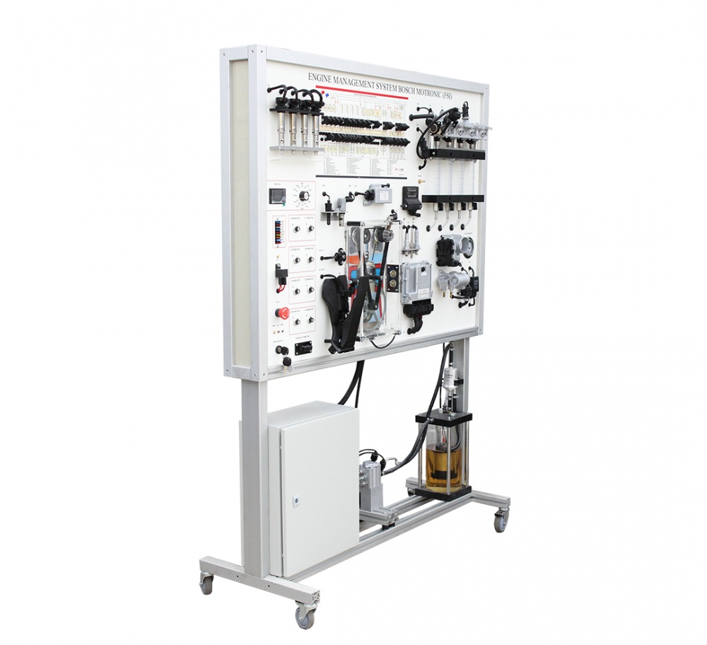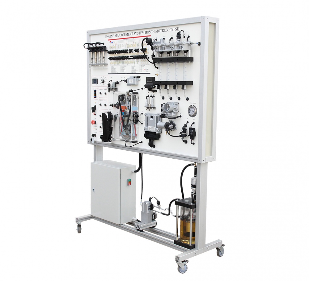 Training stand of Engine Management System Bosch Motronic (FSI) MSFSI02  offers a hands-on learning experience about modern car, demonstrating the workings of a direct petrol(gasoline) injection system. This specialized device includes all the engine management components as in the real car, such as fuel supply, exhaust and ignition systems, helping users understand how these parts interact.