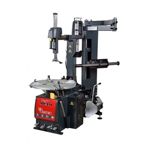 Automatic tire changer with tilting pole and two rotation speeds. Equipped with a 22-inch rotation table (outer grip) with pneumatically controlled grips and a tire bead breaker.