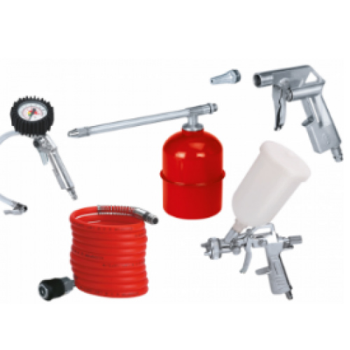 Komplektā ietilpst ietver: spirālveida šļūtene, gaisa spiediena pistole, riepu spiediena mērītājs/pistole, eļļas izsmidzināšanas pistole, krāsas izsmidzināšanas pistole ar vāciņu.