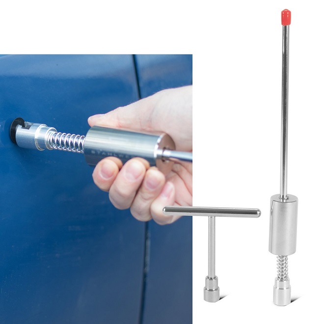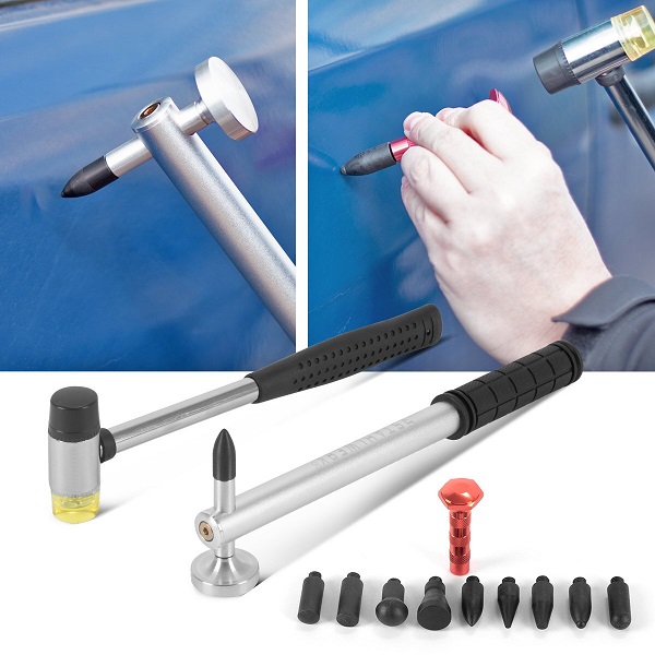 The comprehensive STAHLWERK car smart repair set is perfect for the effective, paint-friendly removal of various types of dents and dings, such as hail damage. The various tools are suitable for different types of damage: A flexibly adjustable slide hammer, a dent puller with levers, adjustable latch, strong metal spring, paint-friendly rubber feet and an effort-saving bridge puller with rubber feet are all part of the set, as are a hot glue gun, two hammers and other helpful accessories for dent removal. The STAHLWERK car repair set contains 36 different sizes of pull adapters. A line board makes it easier to find small, barely visible dents. The impact pins and a rubber mallet included in the set are used to smooth out raised areas. The hot glue gun including ten glue sticks heats up quickly and enables safe working thanks to the drip-free nozzle