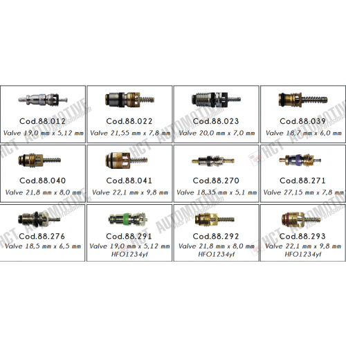 Rinkinyje yra automobilinių kondicionierių 12 skirtingų tipų vožtuvai.