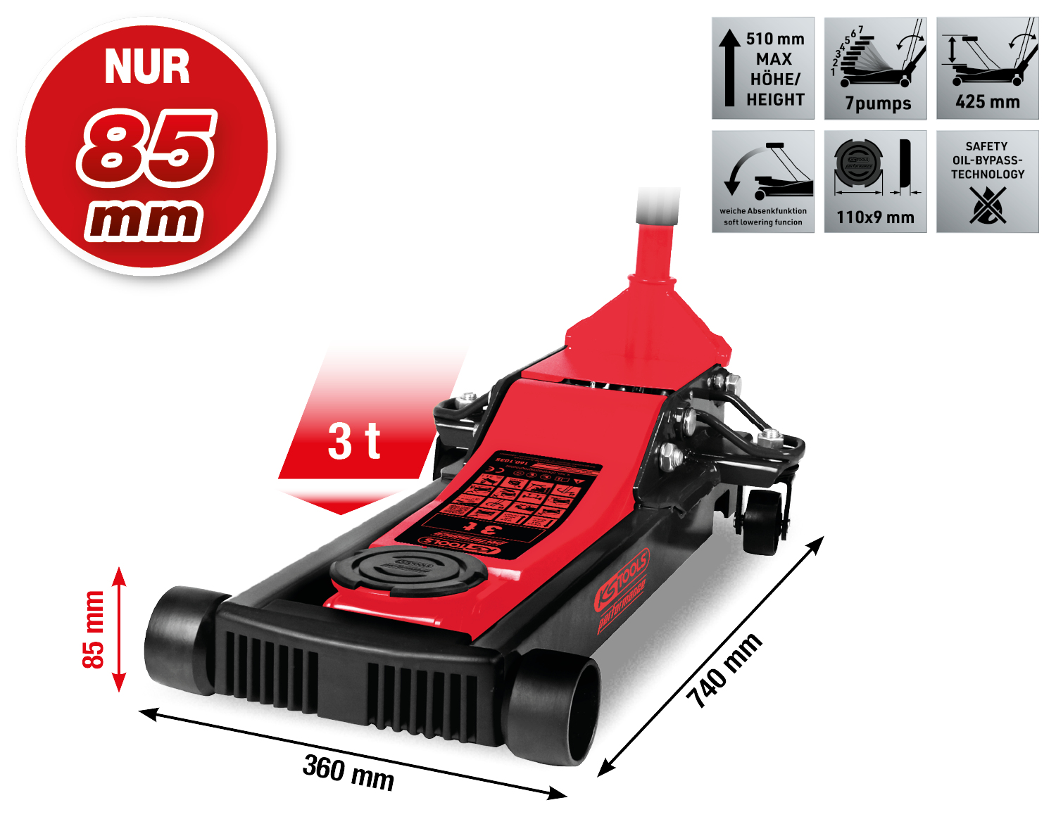 didelio našumo hidraulinis plieninis transporto priemonių domkratas, 3000 kg, kėlimo aukštis: 85–510 mm