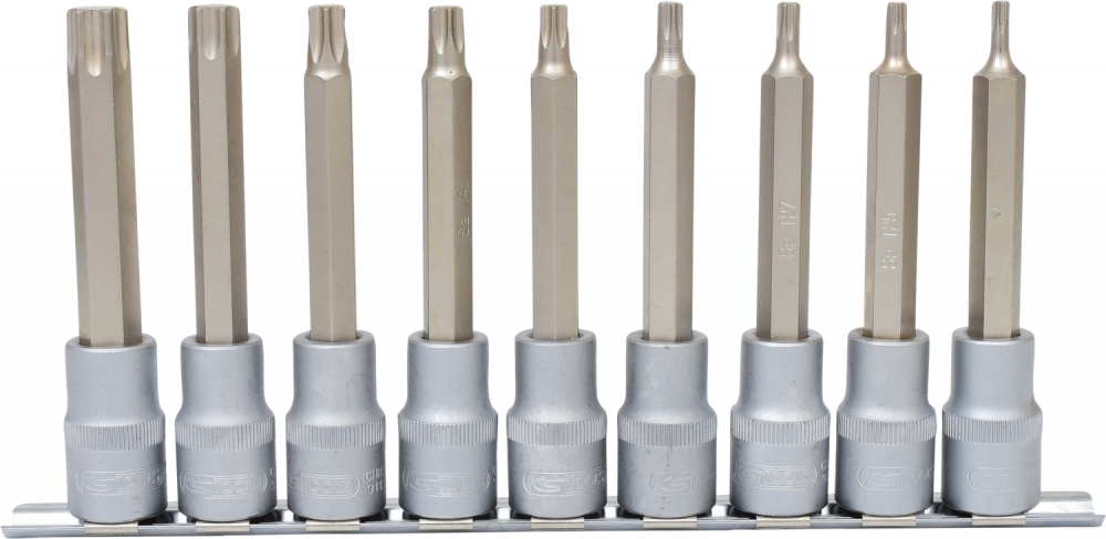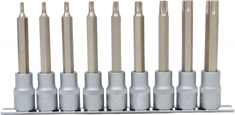 1/2" nuimamų galinių galvučių su antgaliais komplektas Torx, ilgas, 9 dalių, T20-T60