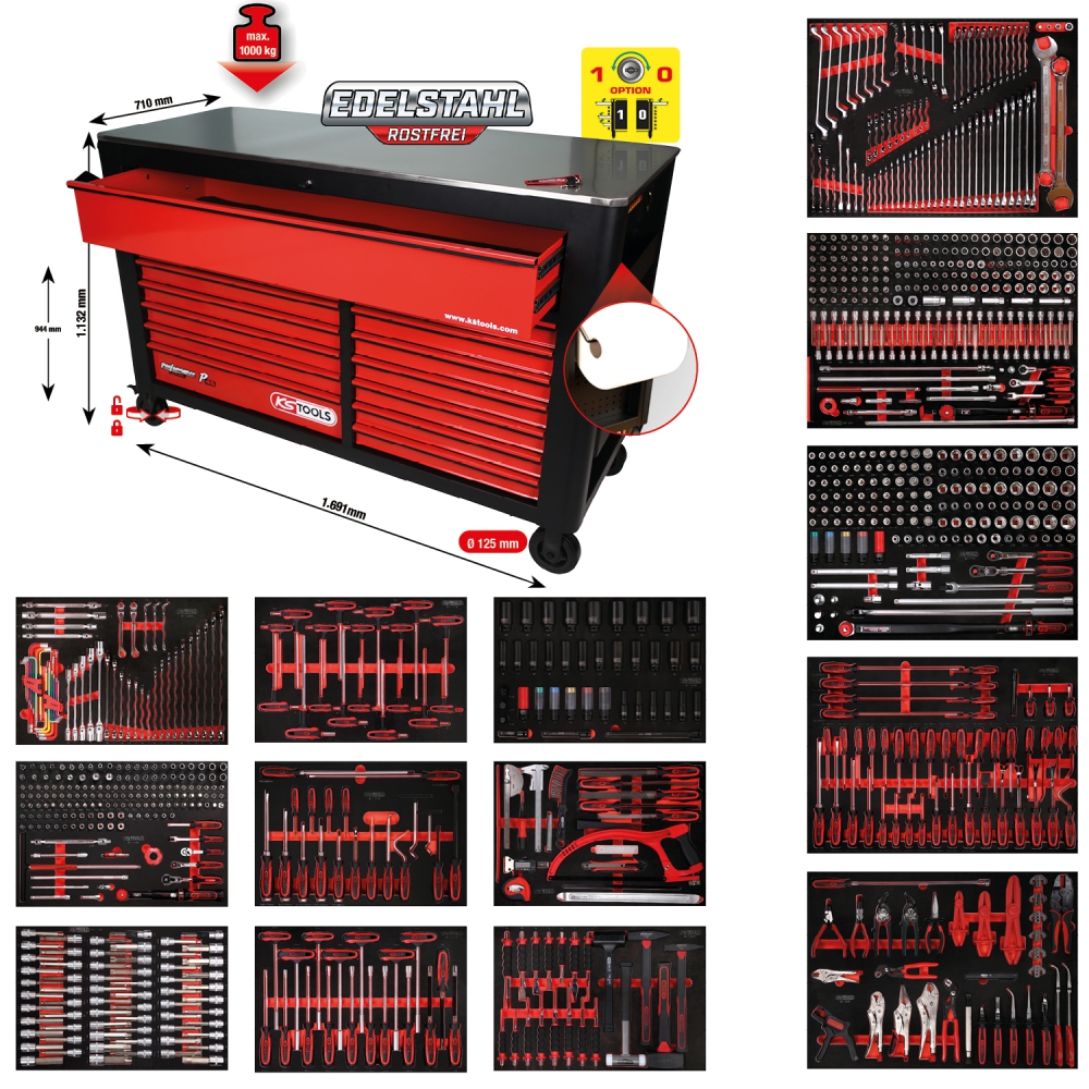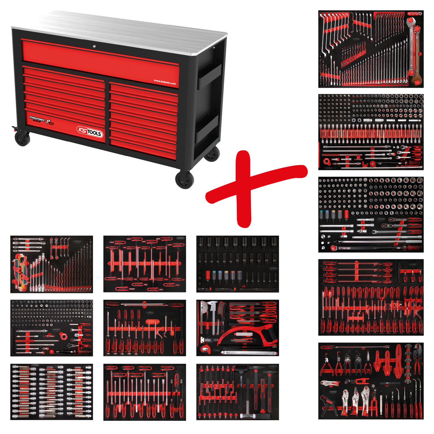 „Performanceplus“ dirbtuvių vežimėlio komplektas P45 su 950 įrankių 13 stalčiams