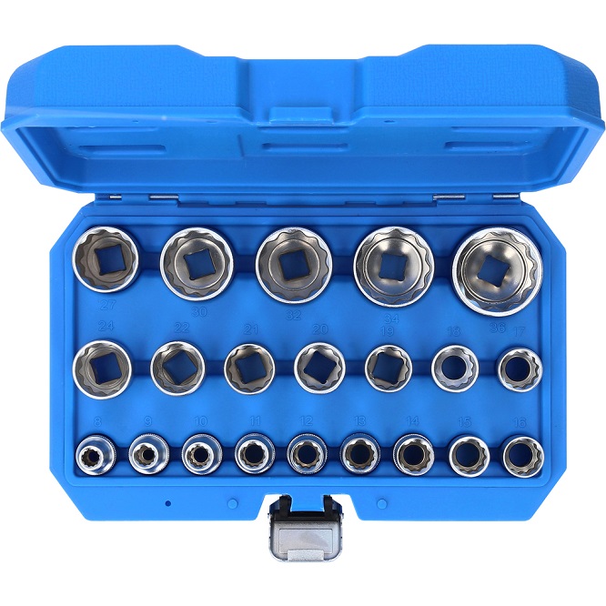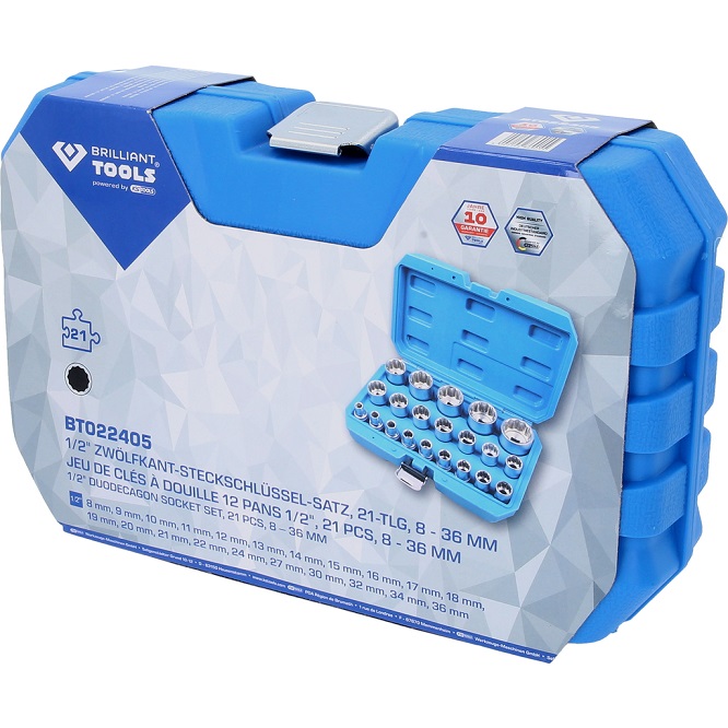 The 21-piece BRILLIANT TOOLS socket spanner set is manufactured according to DIN. The entire set has a 1/2" (12.5 mm) square socket drive. It comes in a practical case with metal hinges and fasteners with moulded tool holders. The labels inside the case enable the right inserts to be found quickly. The total of 21 metric bi-hexagon sockets have spanner widths from 8 mm to 36 mm with an overall length of 38 mm.