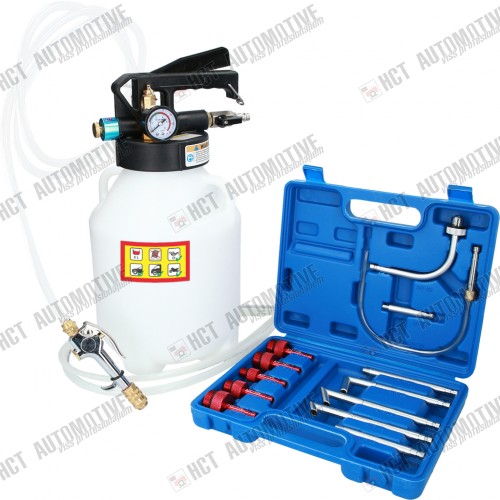 The BRILLIANT TOOLS transmission oil filling device with adapter BT621000 is excellently suited for filling transmission and differentials. This pneumatic transmission oil filling device distinguishes itself with its durability, performance and dependability. It has a reset function for transmissions with overflow openings. The adapter set includes 8 ATF adapters with various exit angles and adapter threads that are more compatible with Ford, Mercedes Benz, VW, Audi, Porsche, Škoda. Furthermore, all adapters are stored in a stable plastic case which guarantees durability for daily use in the workshop.