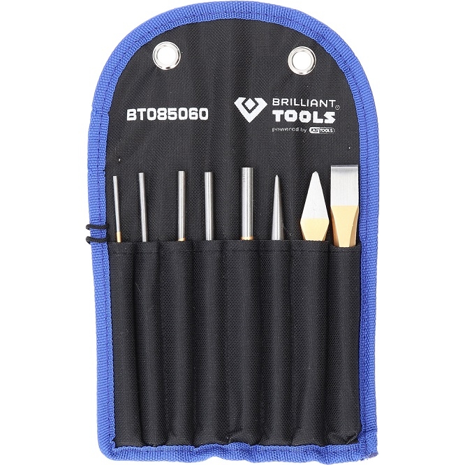 The 8-piece BRILLIANT TOOLS chisel and cotter pin punch / pin punch set is a practical assortment of the most common pin punches and chisels. The tools are made of chrome vanadium and tool steel. They are drop-forged and thermally hardened. The hexagonal shaft ensures optimum handling. The flat chisel is used for deliberate breaking in general chiselling and excavation work on brickwork, concrete and loose stone. The cross chisel is excellently suited for chiselling out grooves and ridges. Both cutting edges have a flat shape for optimum force distribution. The chisel and cotter pin punch / pin punch set is supplied in a practical storage bag, which is provided with hanging loops.