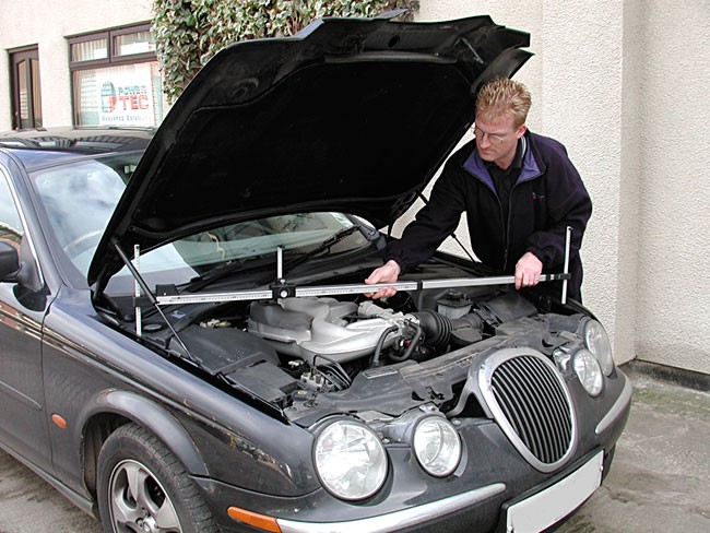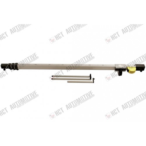 Aliuminio teleskopinis rėmo matuoklis su įmontuota matavimo juosta ir trim reguliuojamais rodikliais, skirtas patikrinti transporto priemonės ilgį ir ašies geometriją. Išsiplečia iki 3 m, užtikrinant pastovų rodiklį bet kurioje pozicijoje.