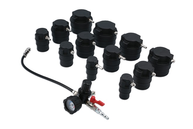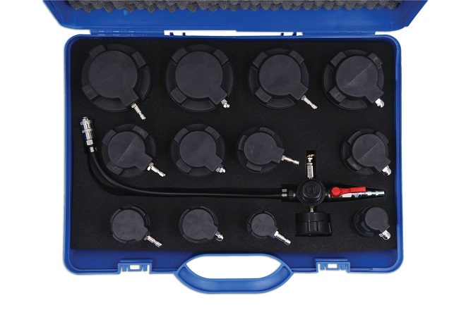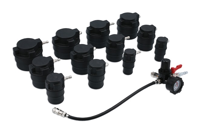 13-daļīgs turbo sistēmas testera komplekts, lai noteiktu spiediena zudumus turbo sistēmā, izmantojot saspiesto gaisu. Piemērots lielākajai daļai turbo sistēmu automašīnām un vieglajiem kravas automobīļiem.