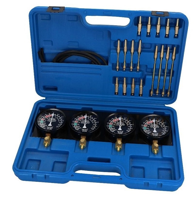 Šajā karburatora vakuuma sinhronizācijas instrumentu komplektā ietilpst gari un īsi karburatora adapteri un savienotāji ērtai piekļuvei. Četri vakuummetri (0–76 cmHg) ir piestiprināti uz vienas metāla pamatnes, tāpēc ir ļoti viegli pievienot šļūteni un salīdzināt vērtības.