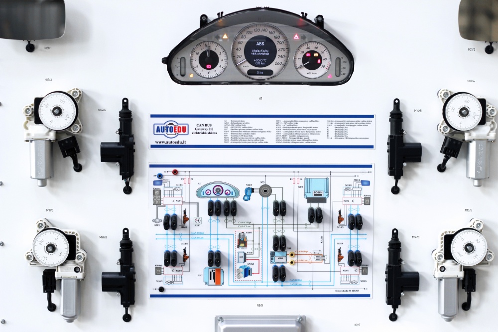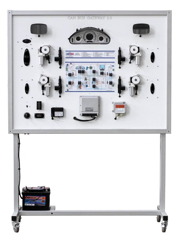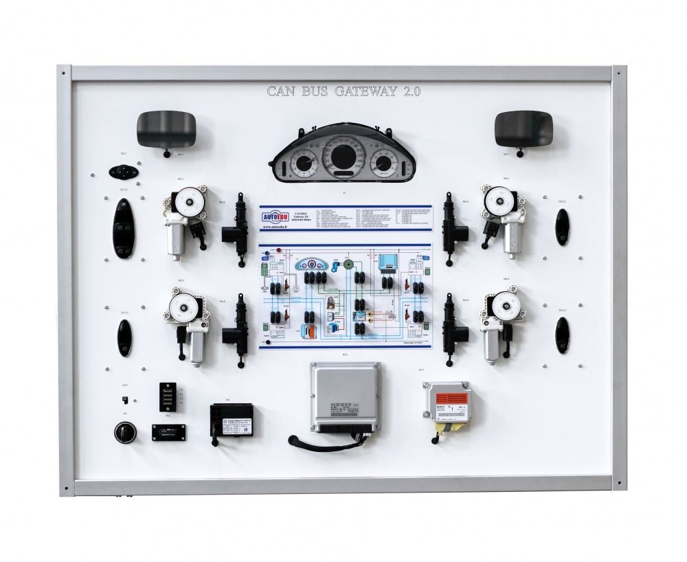 Educational trainer designed to provide an understanding of the CAN BUS network system through hands-on experience. Based on OEM components from Mercedes-Benz, featuring the CAN GATEWAY 2.0 system. The trainer includes components such as the dashboard, engine ECU, smart key module, SRS Airbag ECU, and various control modules, all connected through a detailed internal network. It offers a realistic and practical approach for students to learn about CAN BUS networks, including the diagnosis of system faults and component interactions.