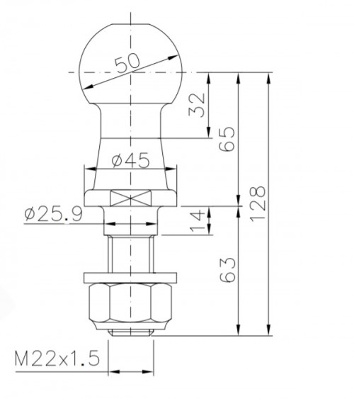 Oriģināla AL-KO skrūvējama sakabes tapa 150 mm gara. Vītnes garums 45 mm ar diametru 22 mm. Bumbas diametrs 50 mm. Vilkšanai paredzētais svars max. 3.5t.