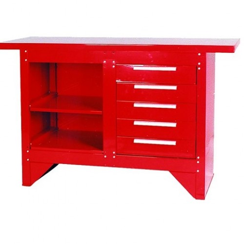 Metāla darba galds ar plauktiem un atvilktnēm.