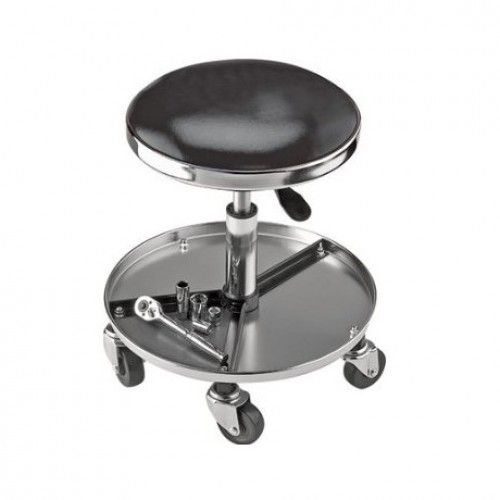 Pārvietojams hromēts servisa krēsls ar regulējamu augstumu. Augstuma regulēšanai krēsls ir aprīkots ar pneimocilindru. 5 izturīgi poliuretāna riteņi ar gultņiem.