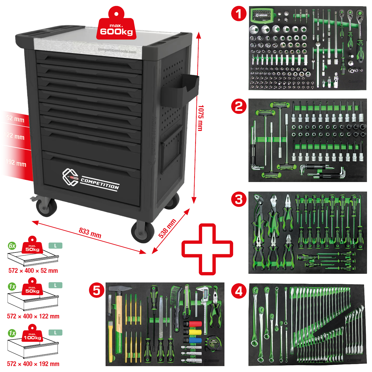 COMPETITION инструментальная тележка с 8 ящиками и комплектом из 341 инструментов премиум-класса