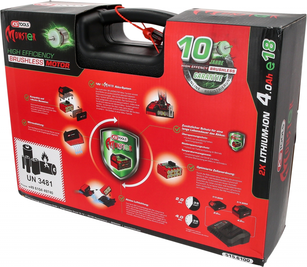 Комплект бесщеточных аккумуляторных ударных винтовертов eMONSTER 1/2“ 515.6100 - Мощность 690 Нм - Включая 2 аккумулятора на 4,0 Ач и устройство быстрой зарядки на 8 A – при онлайн-регистрации предоставляется 10-летняя гарантия на бесщеточный двигатель!