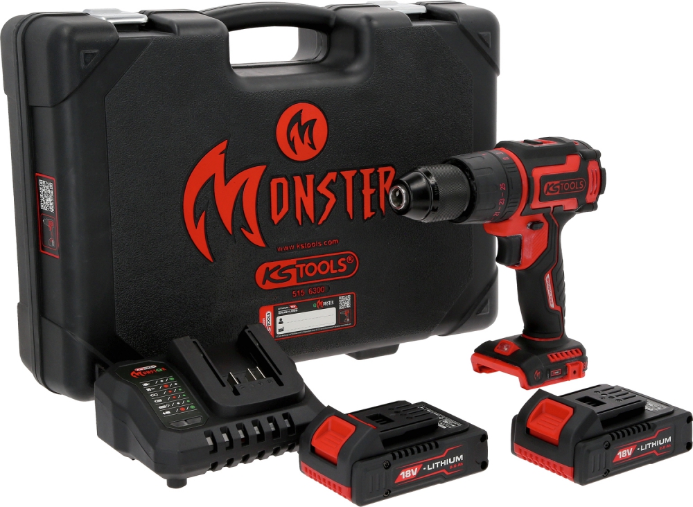 Комплект бесщеточных аккумуляторных дрелей-винтовертов eMONSTER 18V 515.6300 - Двигатель мощностью 60 Нм, металлический быстрозажимный сверлильный патрон Röhm 13 мм, выбор крутящего момента, 2-х ступенчатый редуктор, функция 3-в-1, LED-подсветка - Включая 2 аккумулятора на 2,0 Ач и зарядное устройство – при онлайн-регистрации предоставляется 10-летняя гарантия на бесщеточный двигатель!
