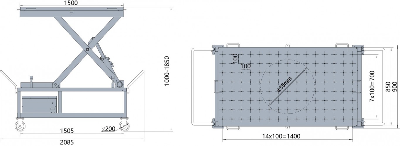 Отверстия (100 мм x 100 мм) на рабочей платформе для позиционирования и крепления специализированных деталей.