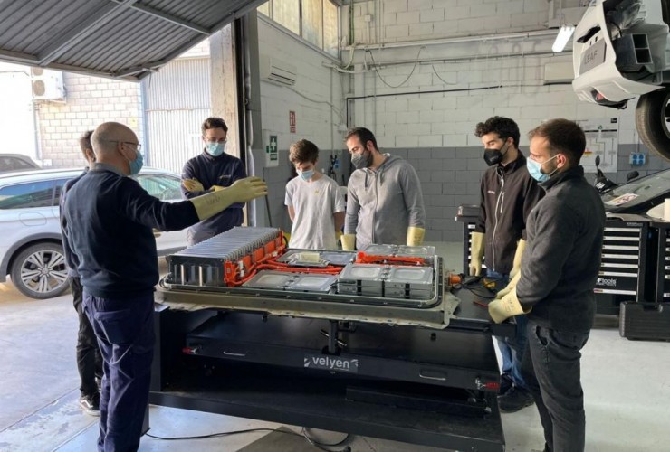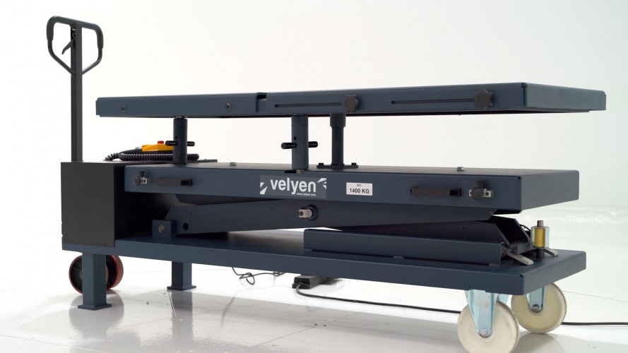 Velyen model 4EE1190 / 91 lifting table manufacturing available for VE batteries and hybrid motors, removing heavy parts 1. Platform with a grid hole pattern, lifting table for special tools. 10 mm. every 100 mm. (Custom manufacturing depending on OEM) 2. Longitudinal and transverse inclination + -30mm, mounting plate is separated and slidable 3. 1200 Kgs or 1400 Kgs as two options. 4. Made 100% by Spain, high quality and reliability 5. With mechanical lifting drawbar for greater comfort in loading/unloading 6. Extendable platform 1756-2066 mm. i.e. +310 mm extensible