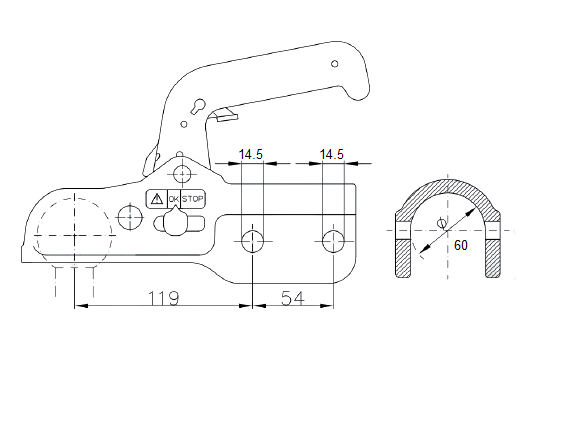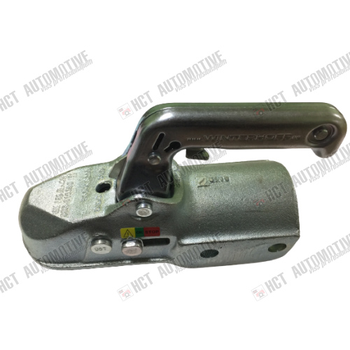 Блокировочный механизм Winterhoff 350-RCH-K1414 с индикатором изготовлен из чугуна. Для полуприцепов массой до 3500 кг. Максимальная вертикальная нагрузка 200 кг. Подходит для диаметра 60 мм. С двумя горизонтальными отверстиями для крепления диаметром по 14.5 мм с каждой стороны.