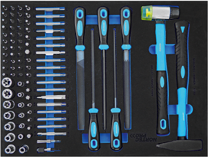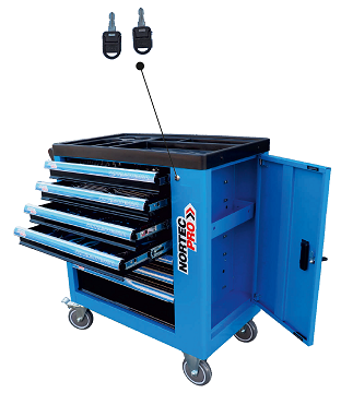 Удобная ручка позволяет свободно перемещать тележку, а шкаф оборудован 7 ящиками, 6 из которых заполнены качественными рабочими инструментами. Тележка имеет боковой отсек для хранения различных деталей. Кроме того, тележка оснащена ключами для ее закрытия.
