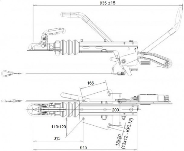Механизм тормозов инерционный KNOTT KF 20A с тяговым механизмом (вертикальная нагрузка до 100 кг). Предназначен для прицепов с V-образной тягой. Допустимая полная масса прицепа от 1100 до 2000 кг.