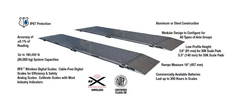 Rugged AX900™ weigh bridges are available in a variety of lengths, capacities and configurations to weigh anything from single to multi-axle vehicles in locations where permanent scale installations are not feasible. Cable-free operation is made possible by embedded radios enabling wireless communication back to a variety of devices, while digital output still allows for cable backup. The AX900™ series also utilizes stainless steel, hermetically sealed, shear beam load cells to weigh loads up to 180,000 lb (80,000 kg) with an accuracy of ±.1%.