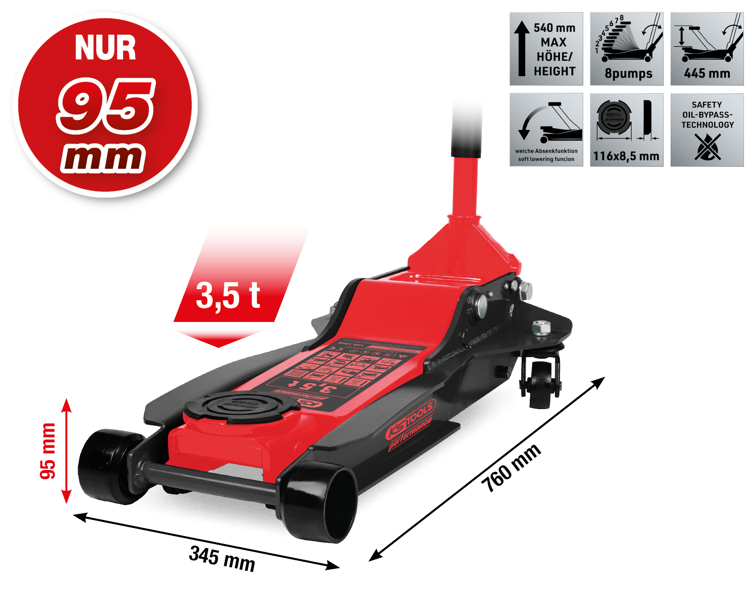 performance hidrauliskais tērauda autopacēlājs, 3500 kg, zems, pacelšanas augstums: 95-540 mm
